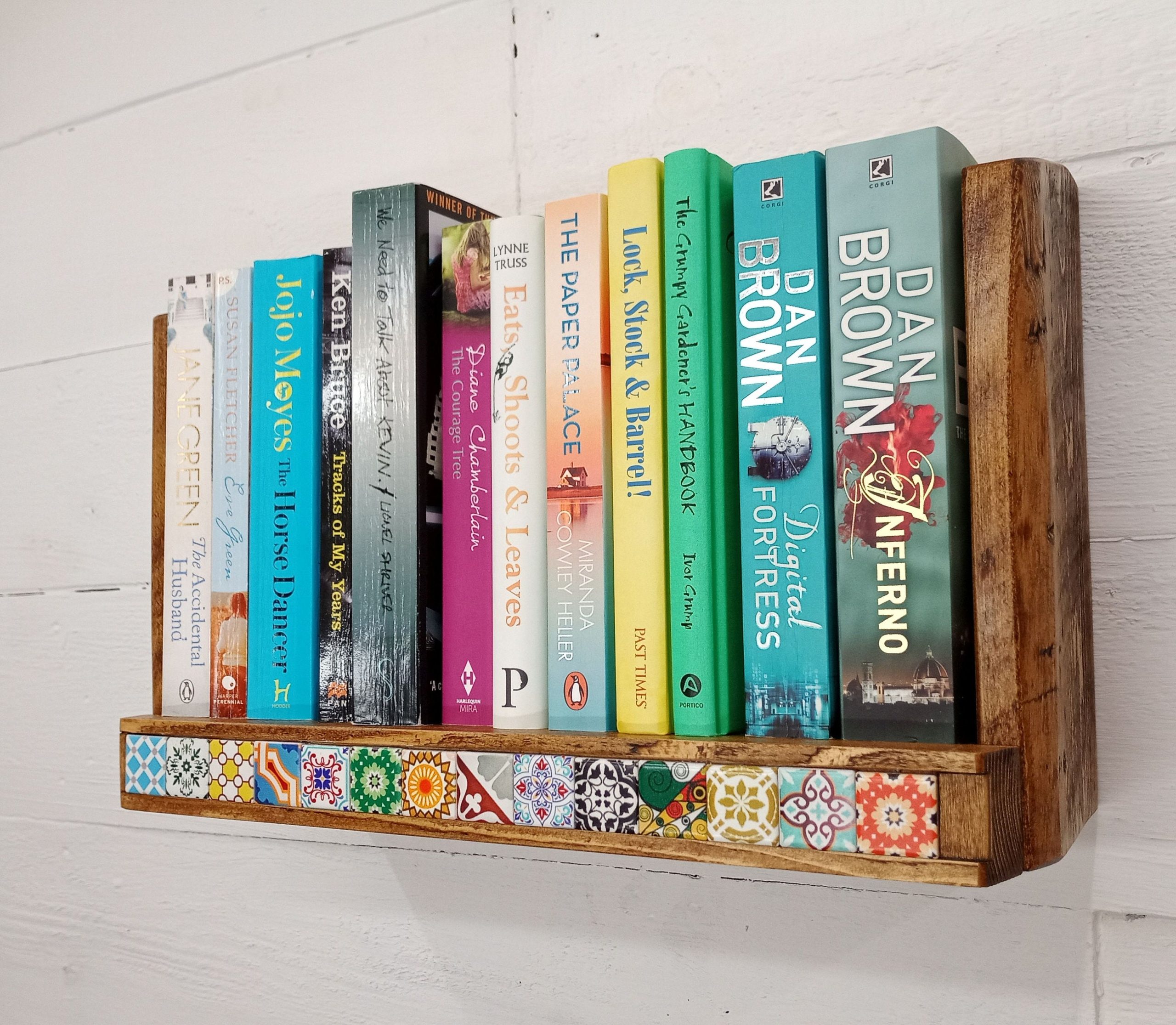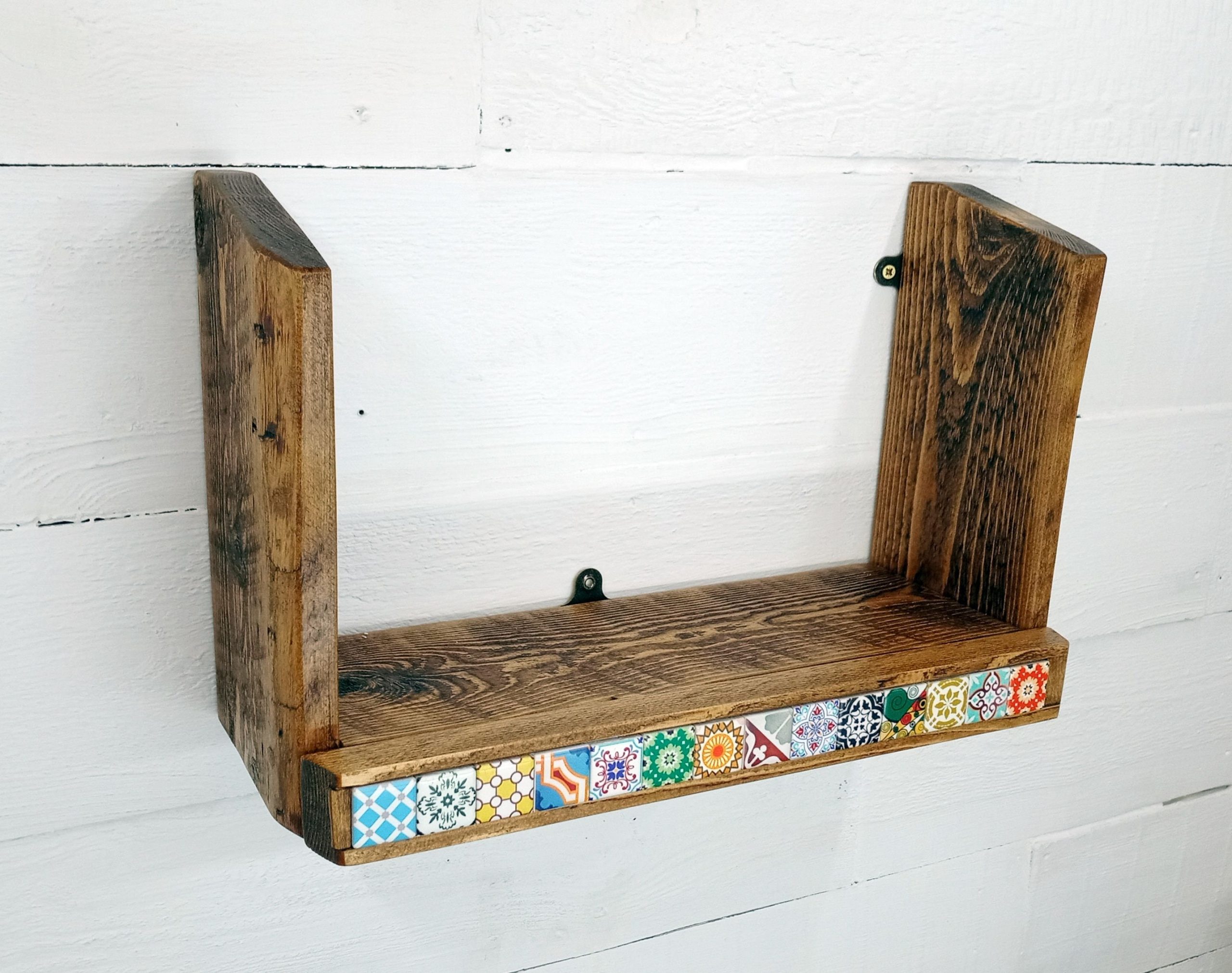 – Each shelf is unique, with natural wood grain and tile variations